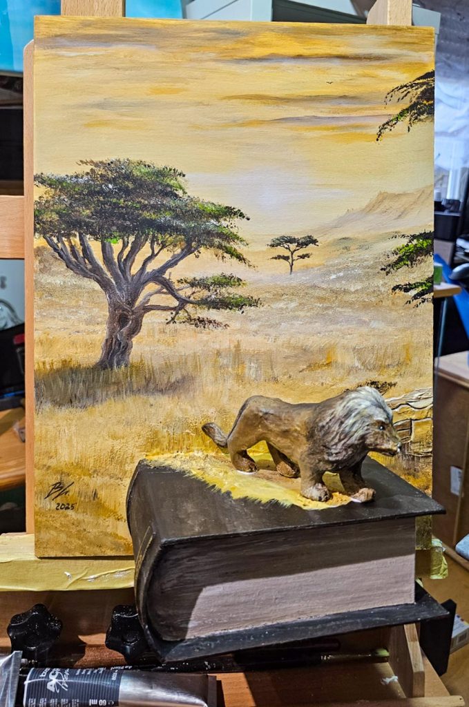 Malplatte mit Holzrahmen 4cm, Buch und Löwe aus Pappe mit Acrylfarben bemalt.